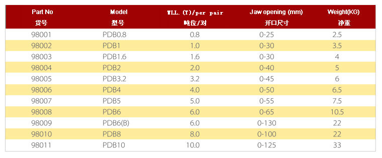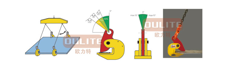 .額定載荷是指吊鉗成對(duì)使用、吊點(diǎn)夾具為60度時(shí)允許起吊的最大重量,吊裝作業(yè)中兩只或4只配套成組使用